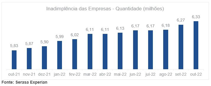 O Indicador de Inadimplência das Empresas da Serasa Experian revelou que, em outubro, o país tinha 6.332.952 de negócios com o nome no vermelho. Essa é a maior quantidade atingida desde o início da série histórica do índice, em 2016. O levantamento também registrou 44,8 milhões de dívidas no mês, que equivalem a R$ 106,4 bilhões. Em média, cada CNPJ negativado possui 7 contas atrasadas a pagar.