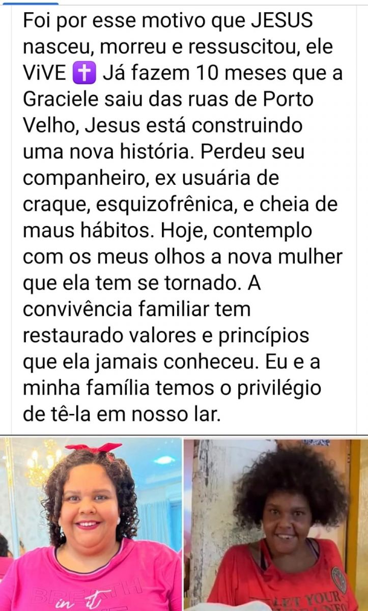 Uma postagem da pastora Silvana detalha o antes e o depois de Graciele: “Foi por esse motivo que Jesus nasceu, morreu e ressuscitou. Ele vive. Já fazem (sic) 10 meses que a Graciele saiu das ruas de Porto Velho, Jesus está construindo uma nova história. Perdeu seu companheiro, ex-usuária de craque (sic), esquizofrênica e cheia de maus hábitos”.