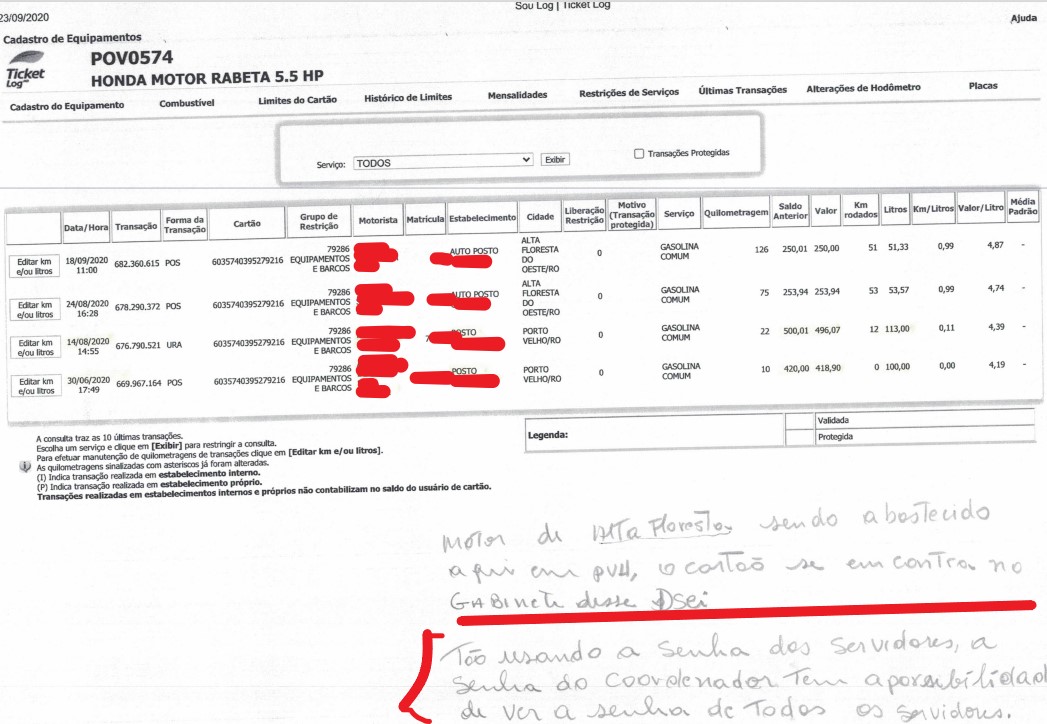 Anotações dos fiscais do contrato: "Motor de Alta Floresta sendo abastecido aqui em PVH, o cartão se encontra no gabinete desse DSEI; Tão usando a senha dos servidores, a senha do coordenador, tem a possibilidade de ver a senha de todos os servidores"