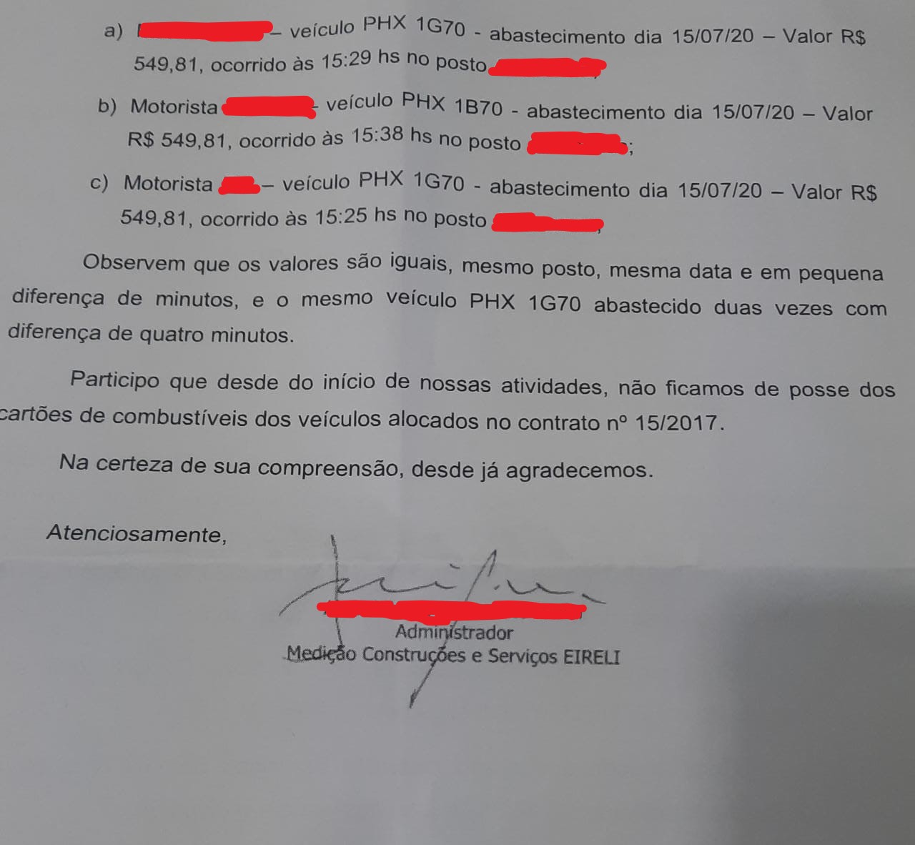 Em março do ano de 2021, a empresa Medição, responsável pelo contrato do aluguel de veículos e motoristas fez um ofício questionando o coordenador do DSEI sobre o abastecimento de veículos feito por profissionais já desligados da empresa.