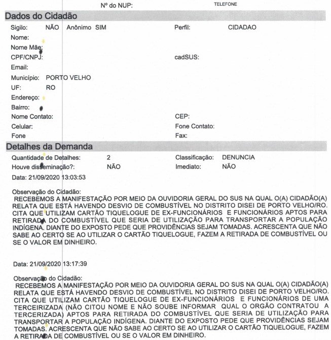 Eles contam que, em setembro de 2020, foi feita uma primeira denúncia oficial sobre o desvio de combustíveis dentro do DSEI, na capital de Rondônia. O DSEI é ligado a Sesai, órgão especializado em saúde indígena do Ministério da Saúde, à época comandando pelo general reformado do Exército, Eduardo Pazuello.
