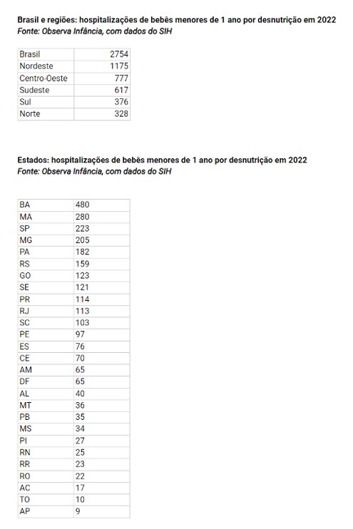 “No cenário atual, embora o sistema registre uma pequena redução no número de internações de bebês menores de 1 ano por desnutrição no país de 2021 para 2022, de 2.946 para 2.754 hospitalizações, podemos considerar que a tendência se mantém - o que é preocupante”, avalia o coordenador do Observa Infância.