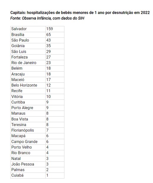Em 2022, o Sistema Único de Saúde (SUS) registrou 2.754 internações de bebês menores de 1 ano por desnutrição, sequelas da desnutrição e deficiências nutricionais - o equivalente a sete por dia em todo o país. Dentre estados e capitais, Bahia e Salvador concentraram o maior número de hospitalizações: respectivamente 480 e 159.