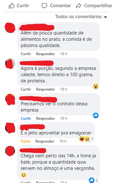 Os comentários reforçam as reclamações dos funcionários públicos: “Além de pouca quantidade de alimentos no prato, a comida é de péssima qualidade”.