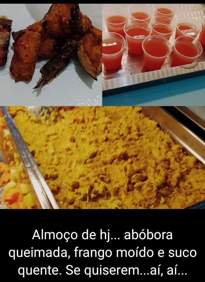 Segundo eles, o “almoço de hoje: abóbora queimada, frango moído e suco quente. Se quiserem, ai, ai”.