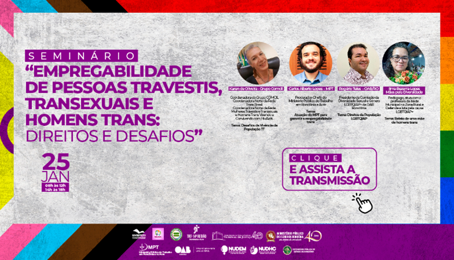 Nesta quarta-feira (25/1) o Comitê Interinstitucional de Equidade de Gênero, Raça e Diversidade, das 8h às 12h e 14h às 18h, o seminário “Empregabilidade de Pessoas Travestis, Transexuais e Homens Trans: Direitos e Desafios”, no auditório do edifício-sede do Tribunal de Justiça de Rondônia.