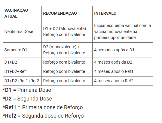 Para receber a dose da vacina bivalente, a pessoa deve ter concluído, pelo menos, o esquema primário de vacinação contra a covid-19, ou seja, ter recebido as duas primeiras doses da vacina monovalente, que são aquelas disponíveis atualmente. Quem já tem o esquema completo com as duas doses de reforço também pode ser vacinado com o novo imunizante. O intervalo entre a última dose recebida e a bivalente deve ser de quatro meses.