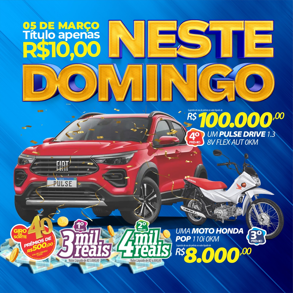 É um Fiat Pulse zero km na garagem, ou o valor de 100.000 reais em dinheiro, quem ganhar vai escolher e neste domingo pode ser você!