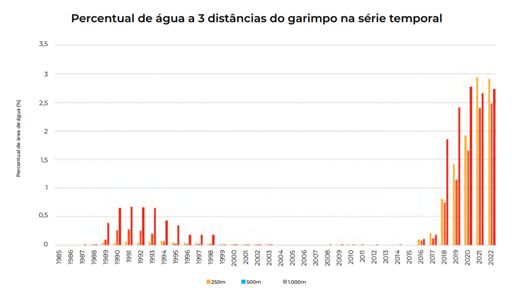 “Se olharmos para uma distância ainda menor, de 250 metros de um corpo hídrico, identificamos que 605 hectares da superfície de água do território yanomami estão afetados pelo garimpo, o que corresponde a 3% do total. Essa distância nunca foi tão curta”, explica Bruno Ferreira, também pesquisador do Imazon e do MapBiomas Água.