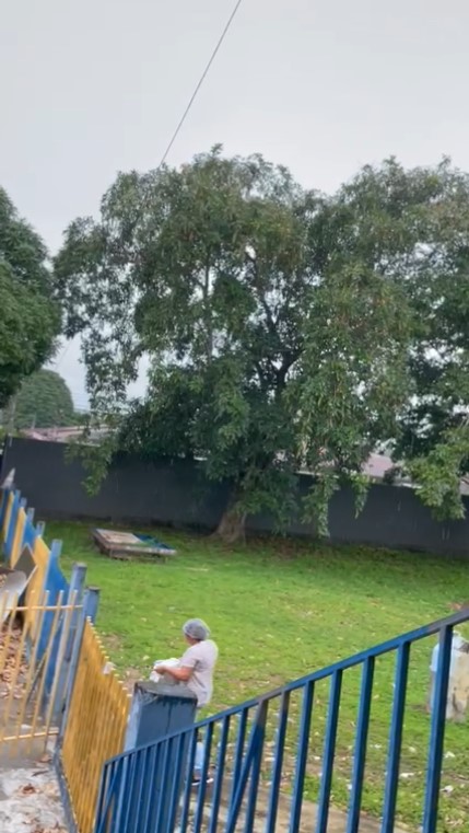 Print de vídeo mostra servidora carregando panela quente embaixo de chuva - Foto: Reprodução de vídeo