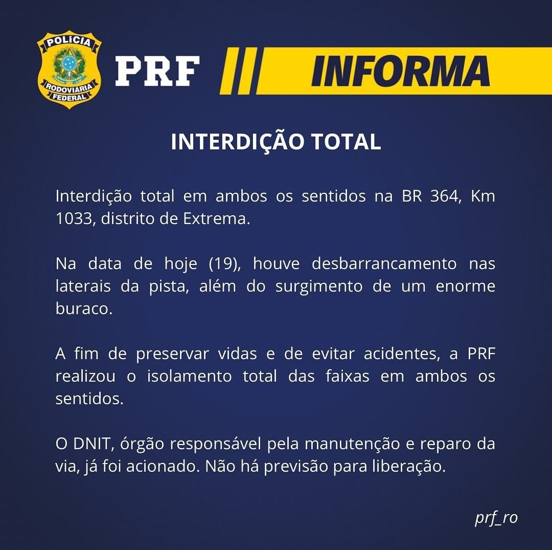 “Com as fortes chuvas, o bueiro não suportou o grande volume das águas e acabou que desestabilizou o corpo da rodovia naquele ponto. O tráfego prosseguiu em meia pista até por volta do meio-dia deste domingo, mas por questão de segurança resolvemos interditar”, explicou o superintendente do Departamento Nacional de Infraestrutura de Transportes (Dnit) de Rondônia, André Santos.