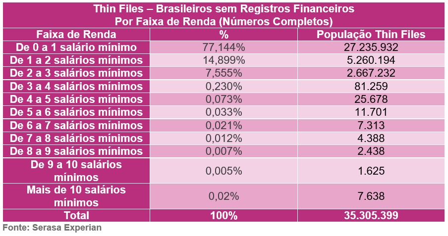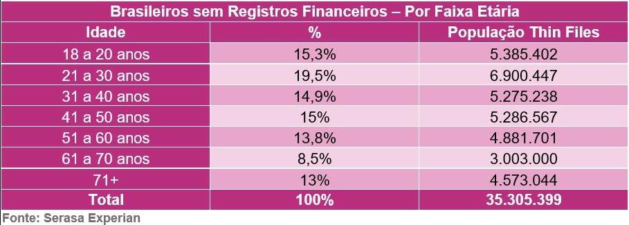 Um estudo inédito da Serasa Experian identificou 35,3 milhões de brasileiros sem registros financeiros, isto é, 21,7% da população adulta do país não possui contas de consumo, financiamentos, empréstimos ou faturas de cartão de crédito registrados em seu CPF, nem mesmo estão no Cadastro Positivo.