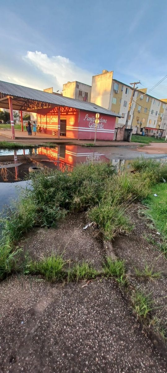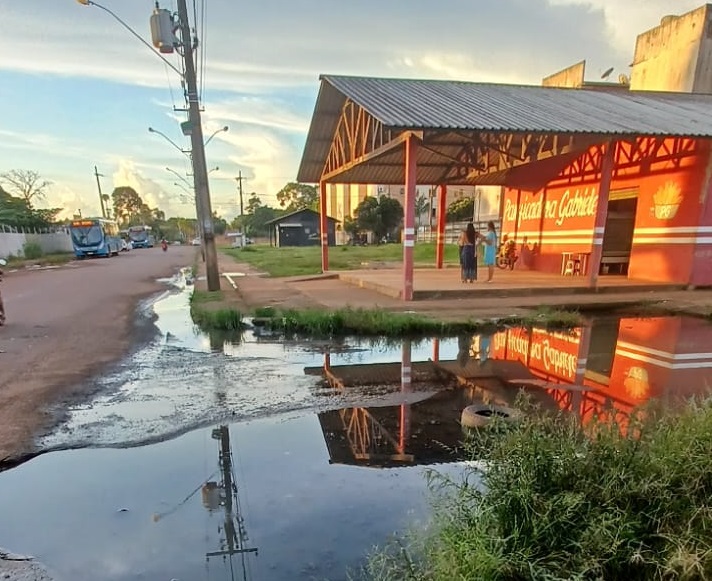 Água servida virou rio e fica ao lado de padaria bastante movimentada no residencial da zona Leste de Porto Velho