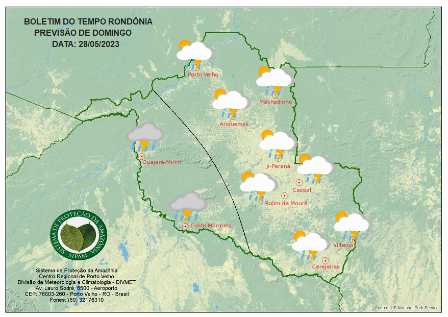 Na capital e demais regiões rondonienses, a previsão é de sol forte e calor, com tempo variando de parcialmente nublado a nublado e com pancadas isoladas de chuva e trovoadas à tarde.