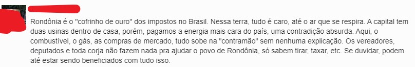 “Rondônia é o ‘cofrinho de ouro’ dos impostos no Brasil. Nessa terra, tudo é caro, até o ar que se respira. A capital tem duas usinas dentro de casa, porém, pagamos a energia mais cara do país, uma contradição absurda. Aqui, o combustível, o gás, as compras de mercado, tudo sobe na ‘contramão’ sem nenhuma explicação. Os vereadores, deputados e toda corja não fazem nada pra ajudar o povo de Rondônia, só sabem tirar, taxar, etc. Se duvidar, podem até estar sendo beneficiados com tudo isso”, desabafou um homem.