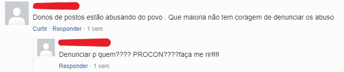 “Donos de postos estão abusando do povo. Que maioria não tem coragem de denunciar os abusos”, comentou um leitor que teve uma complementação a seguir: “Denunciar p quem??? PROCON??? Faça me rir!”.