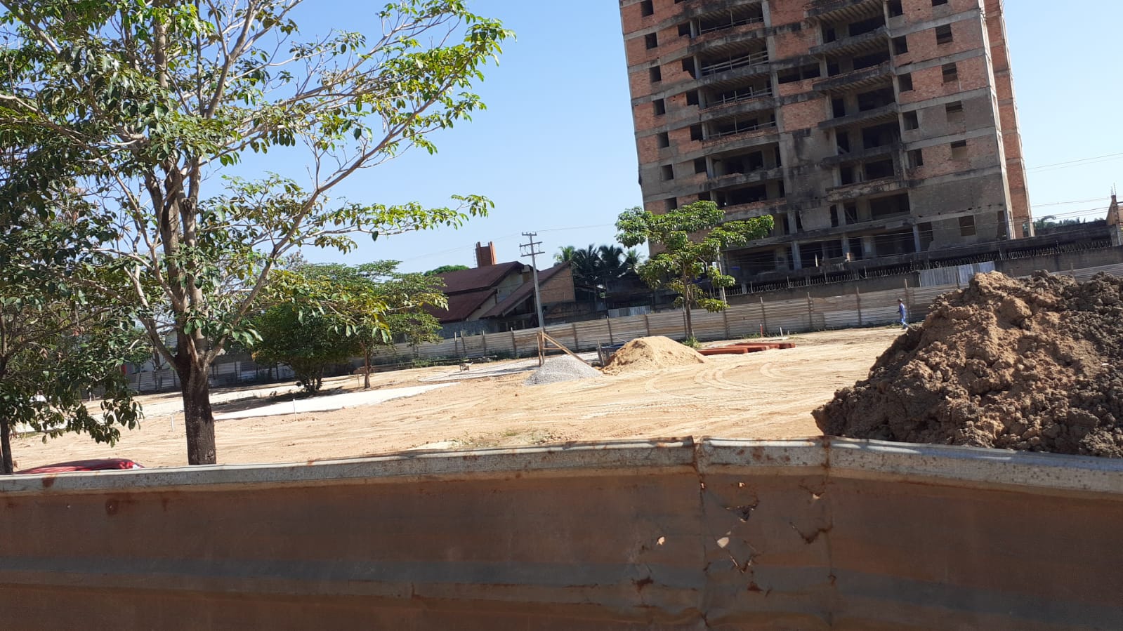 A obra é de responsabilidade da Prefeitura de Porto Velho, gestão Hildon Chaves (União Brasil), com recursos da Caixa Econômica Federal. Após reclamações de moradores próximos da área, o Rondoniaovivo foi até o local e confirmou a denúncia. Dentro do espaço isolado por chapas de alumínio, vimos apenas montes de terra, areia, brita e poucos trabalhadores.