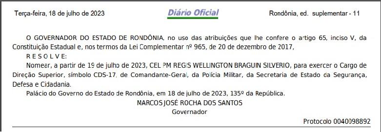 A formalização da troca foi publicada em edição extraordinária no Diário Oficial do Estado de Rondônia