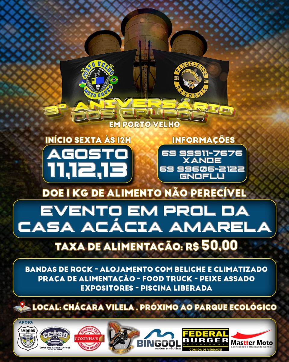 Nos dias 11, 12 e 13 de agosto na Chácara Vilela, em Porto Velho, os grupos Porto Velho Moto Grupo e Bandoleiros M3 Rondônia vão realizar uma grande festa de aniversário. Tudo o que for arrecado no evento será repassado para a casa de apoio Acácia Amarela.