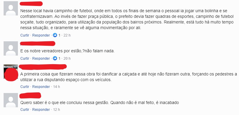 E a população voltou a se manifestar: “Nesse local havia campinho de futebol, onde em todos os finais de semana, o pessoal ia jogar uma bolinha e se confraternizavam. Ao invés de fazer praça pública, o prefeito devia fazer quadras de esportes, campinho de futebol soçaite, tudo organizado, para utilização da população dos bairros próximos. Realmente, está tudo há muito tempo nessa situação, e raramente se vê alguma movimentação por ali”, lamentou um homem.