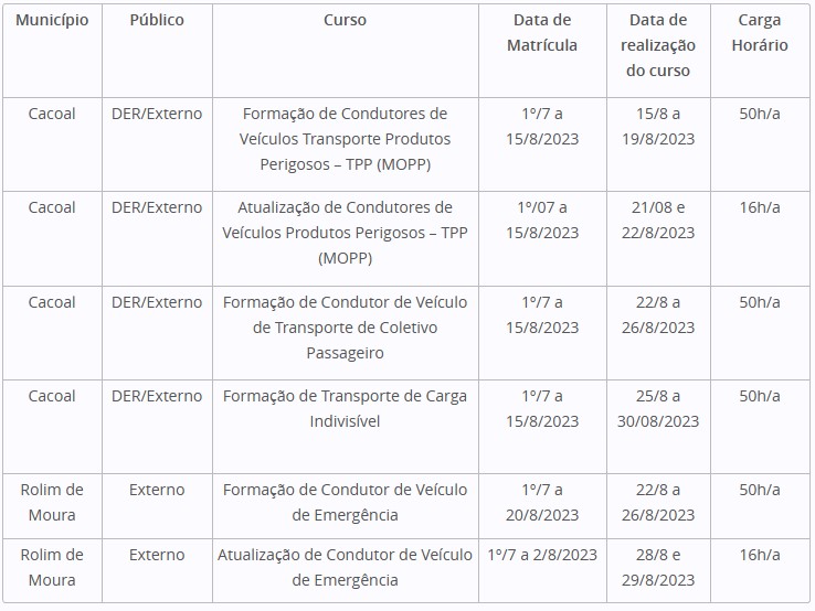 O Departamento Estadual de Trânsito – Detran Rondônia por meio da Escola Pública de Trânsito – EPT divulga os cursos que serão realizados no mês de agosto nos municípios de Cacoal e Rolim de Moura, estipulado no