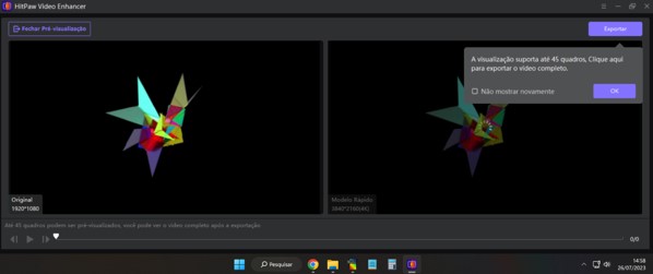 Caso você não tenha certeza se escolheu as opções certas para a melhoria do vídeo, o HitPaw permite que pré-visualize o resultado final. Para isto, basta clicar no botão “pré-visualizar o efeito”, o qual fica localizado logo abaixo do vídeo. Uma nova janela se abrirá, mostrando o resultado do projeto.