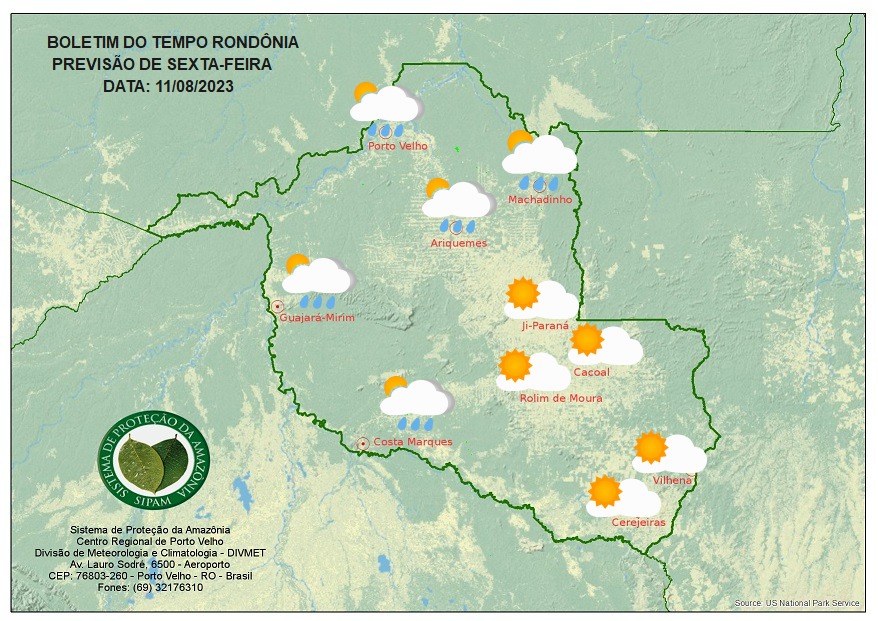 O tempo varia de claro a parcialmente nublado, nas proximidades de Porto Velho terá mais nebulosidade e maior chance de ocorrer pancadas de chuva no final da tarde.