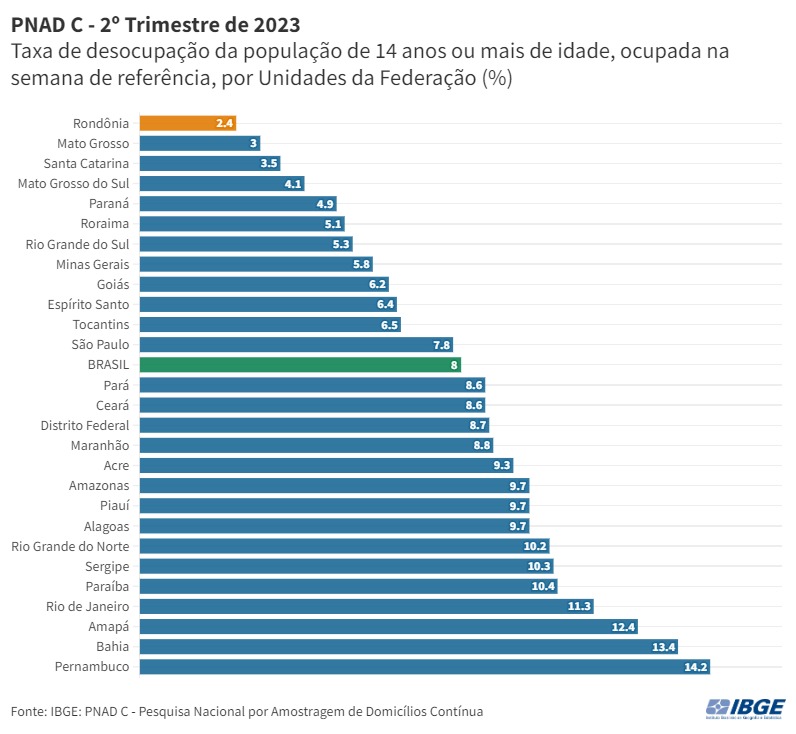 A PNAD Contínua, divulgada pelo IBGE, mostrou que Rondônia permaneceu com a menor taxa de desocupação do país no segundo trimestre de 2023. De acordo com a pesquisa, 2,4% da força de trabalho estavam desocupadas no período. O índice é menor que o registrado no trimestre anterior (3,2%) e no segundo trimestre de 2022 (5,8%).