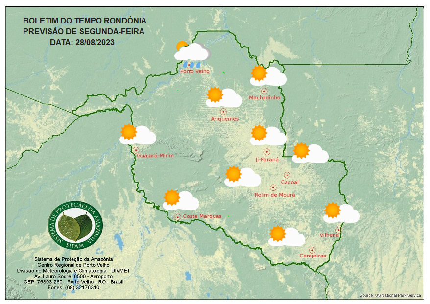 A divisão de Meteorologia do Sistema de Proteção da Amazônia (Sipam) informa que a massa de ar quente e seco predominará no sul da região Norte do país e mantém as temperaturas elevadas e o tempo aberto em toda Rondônia.