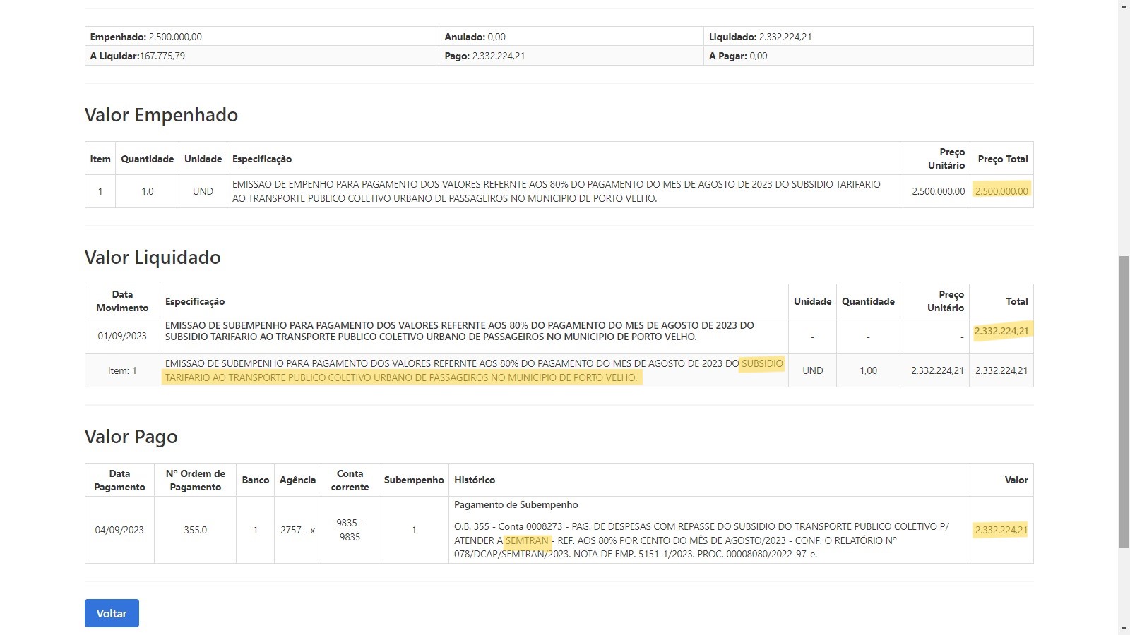 FOTO: Empenho comprovante de pagamento de subsídio / Reprodução do portal da Transparência, acesso em 21/09/23 - 11:47.