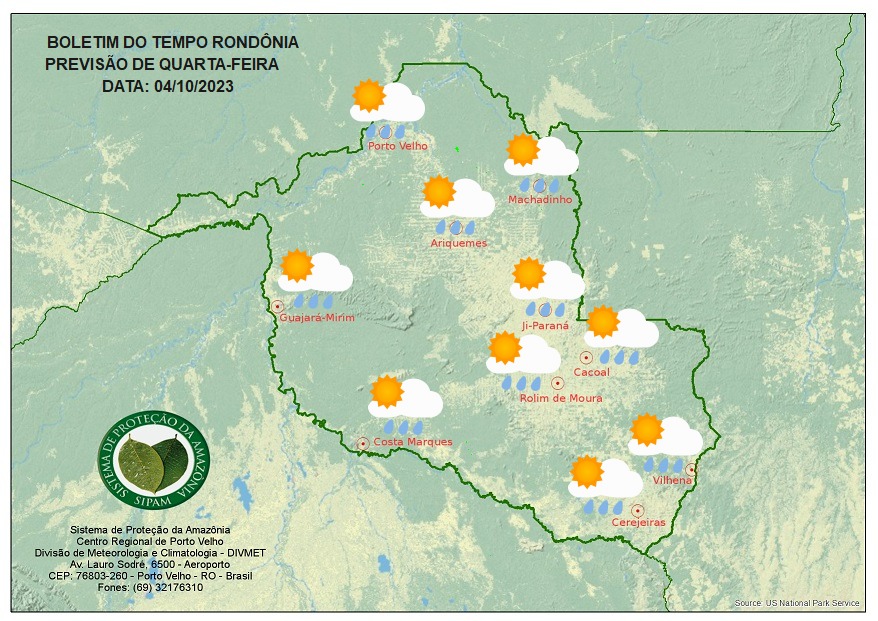 A divisão de Meteorologia do Sistema de Proteção da Amazônia (Sipam) informa que a quarta-feira (04) será de sol forte e muito calor em Rondônia, por conta do fortalecimento do ar quente e seco sobre o Sul da região Norte do país.