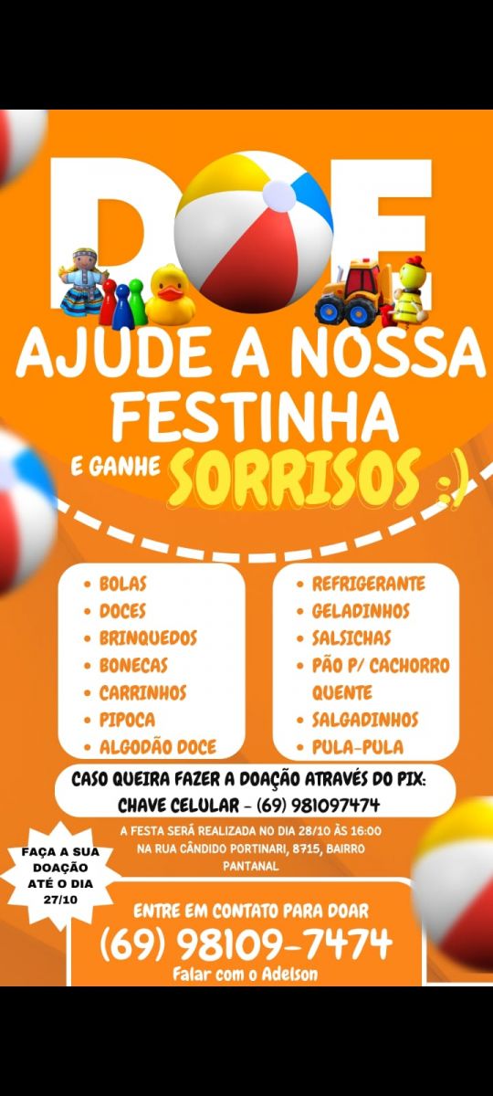 As doações de brinquedos, doces, pula-pula e outros itens são bem-vindas e podem ser feitas até sexta-feira, dia 27. A festa está marcada para o sábado, e o endereço é Rua Candido Portinari, número 8715, no bairro Pantanal.