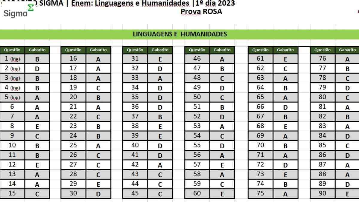 Os professores do Centro Educacional Sigma, em Brasília, elaboraram um gabarito extraoficial do primeiro dia de prova do Exame Nacional do Ensino Médio (Enem 2023). Neste domingo, os candidatos realizaram as provas de linguagens (40 questões de língua portuguesa e 5 de inglês ou espanhol), ciências humanas (45 questões) - além da redação. A aplicação teve 5 horas e 30 minutos de duração.