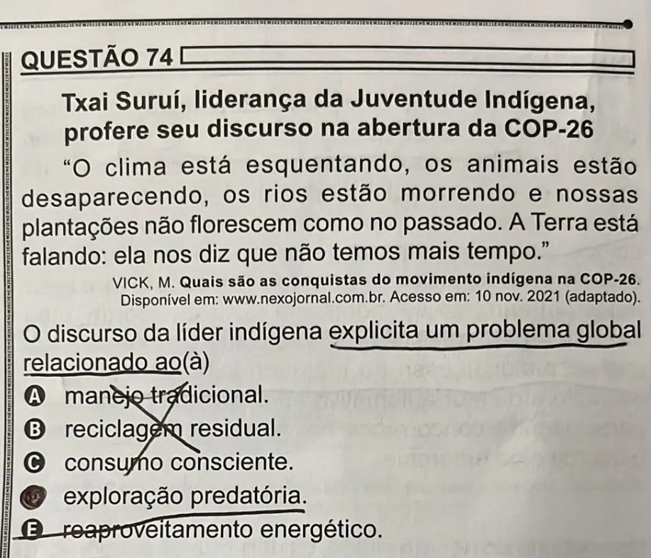 A questão do ENEM citou o seguinte trecho do discurso de Txai Suruí: "O clima está esquentando, os animais estão desaparecendo, os rios estão morrendo e nossas plantações não florescem como no passado. A Terra está falando: ela nos diz que não temos mais tempo".