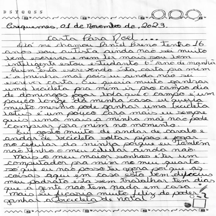 Daniel, um adolescente autista de 16 anos, revela ao Papai Noel seu desejo por uma bicicleta, destacando as dificuldades financeiras da família. Ele menciona ainda o sonho de possuir um computador, sabendo das limitações atuais de sua casa.