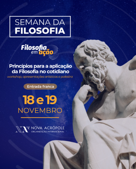 O Dia Mundial da Filosofia 2023 será celebrado na Nova Acrópole com workshop, apresentações artísticas e palestras durante a Semana “Filosofia em Ação”, que norteará cada atividade realizada nos dias 18 e 19 de novembro, neste final de semana. As inscrições podem ser feitas no site acropole.org.br/portovelho/ ou no WhatsApp: (69) 99265-7395. Veja a programação: