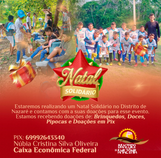 As crianças do distrito de Nazaré, na região do Baixo Madeira, na capital, também merecem um Natal de presentes, ceia e alegria. Foi pensando nesses pequenos que o grupo ‘Banzeiros da Amazônia’ está lançando a campanha no Natal Solidário em prol desses meninos e meninas. As doações podem ser de brinquedos, doces, pipocas e em dinheiro. Qualquer valor pode ser depositado na chave Pix 69 9 9264 3340, da Caixa Econômica Federal, em nome de Núbia Cristina Silvia Oliveira. Lembre-se que o sorriso de uma criança é a assinatura da palavra esperança! Dê o seu apoio!