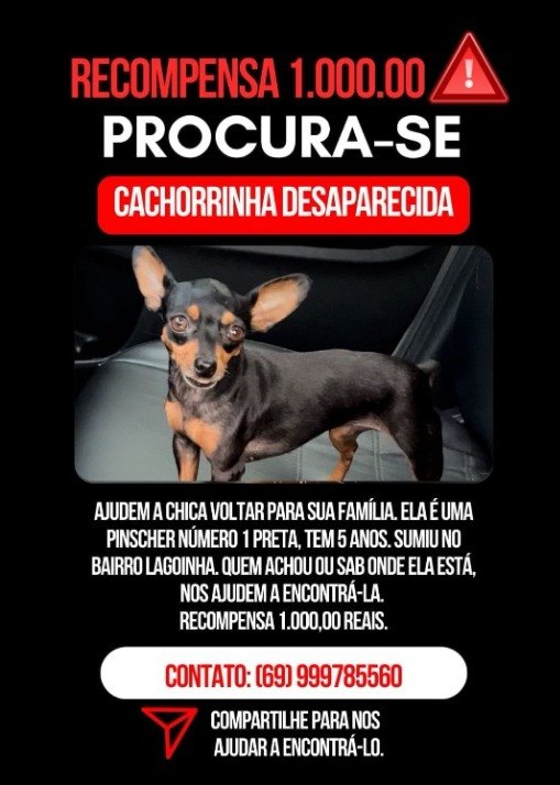 Uma tutora de uma cachorrinha pinscher está oferecendo uma recompensa de R$ 1 mil reais para quem encontrá-la. Chica sumiu no bairro Lagoinha, zona Leste de Porto Velho (RO).