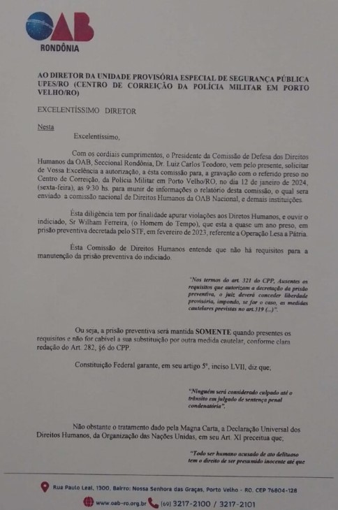 De acordo com a Comissão dos Direitos Humanos da OAB Seccional Rondônia, a manutenção da prisão do jornalista Willian Ferreira da Silva, 59 anos, é uma ilegalidade. O militar está encarcerado há 11 meses, no Centro de Correção da Polícia Militar – Unidade Prisional Especial, em Porto Velho (RO), após ser preso pela Polícia Federal em casa no dia 3 de fevereiro de 2023, na quarta fase da Operação Lesa Pátria.