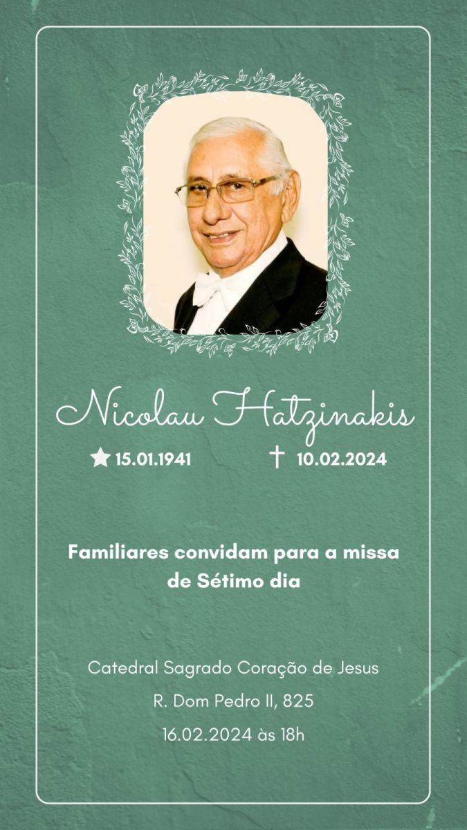 Familiares do senhor Nicolau Hatzinakis convidam amigos e a todos para a missa de Sétimo Dia dele, que faleceu no último dia 10 de fevereiro. A celebração será na Catedral Sagrado Coração de Jesus, no centro de Porto Velho, às 18h, desta sexta-feira(16).Outra missa também acontecerá no mesmo dia na Catedral Metropolitana de Ribeirão Preto, em São Paulo.