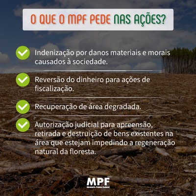 As três fases do projeto já desenvolvidas resultaram no ajuizamento de mais de 3,5 mil ações contra os responsáveis pela retirada irregular de vegetação em áreas superiores a 60 hectares, registradas pelo Projeto de Monitoramento do Desflorestamento na Amazônia Legal (Prodes/Inpe) entre agosto de 2015 e dezembro de 2019. Desse total, 656 processos já tiveram sentença favorável ao MPF e 732 réus foram condenados em primeira instância a pagar indenizações, além de reparar os danos causados pela remoção ilegal de floresta. Mais de 73 mil hectares de mata deverão ser reflorestados, o que equivale a quase 68 mil campos de futebol.