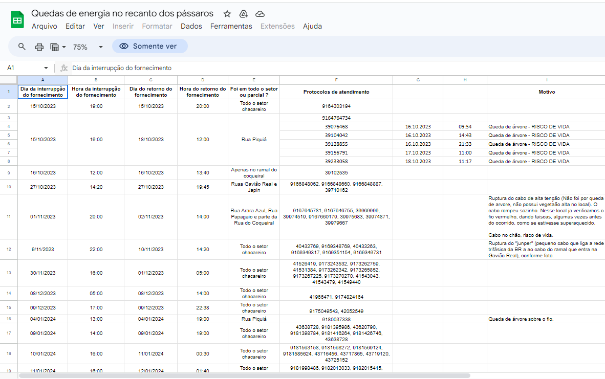 O consumidor, demonstrou uma notável organização ao criar uma planilha detalhada, abrangendo todo o cronograma desde o início das quedas e falhas na região. O relatório inclui datas, horários e a duração estimada de cada interrupção, proporcionando uma visão abrangente dos desafios enfrentados pelos residentes do Recanto dos Pássaros.