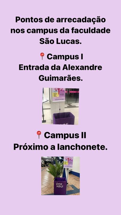 Os pontos de coleta das doações estão distribuídos nos Campi da Faculdade São Lucas: Campus I, localizado na entrada da rua Alexandre Guimarães, e Campus II, próximo à lanchonete.