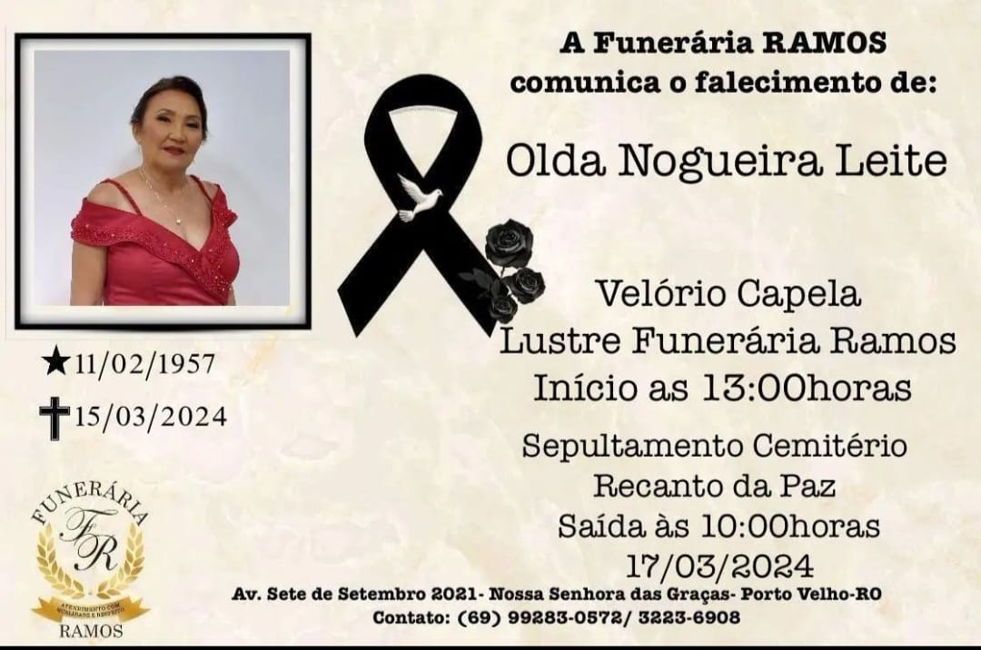 Com bastante pesar o Rondoniaovivo comunica o falecimento de Olda Nogueira Leite, de 67 anos, ocorrida na última sexta-feira (15).