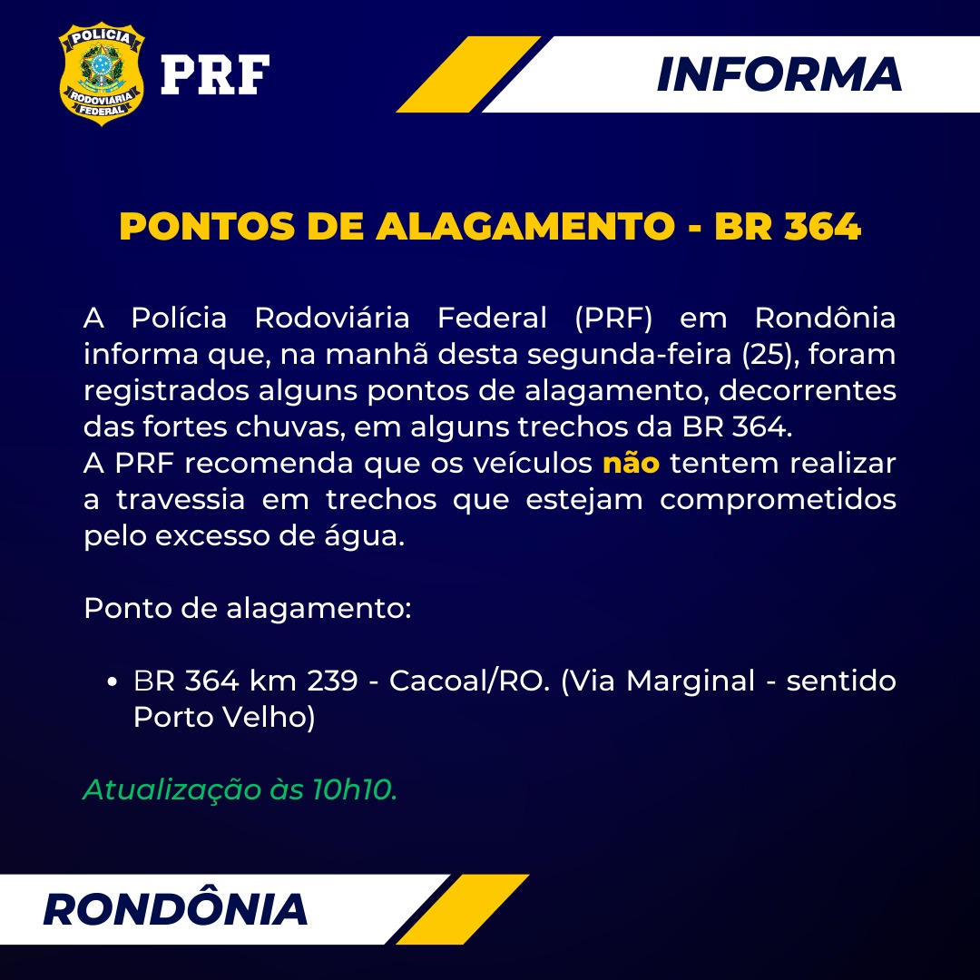 A Polícia Rodoviária Federal de Rondônia (PRF-RO) emitiu um alerta nesta segunda-feira (25) sobre os alagamentos registrados na BR-364, sentido Cacoal a Porto Velho, devido às fortes chuvas que têm ocorrido na região. Segundo informações da PRF, diversos pontos da rodovia foram afetados pelas condições climáticas adversas, resultando em áreas inundadas ao longo do trajeto.