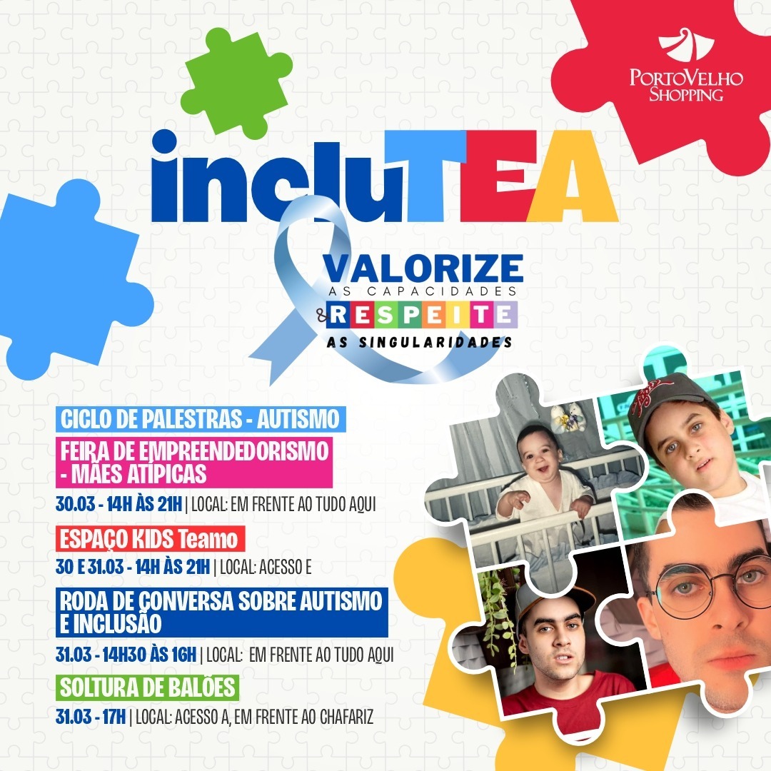 Autismo é o tema do ciclo de palestras que o Porto Velho Shopping está promovendo em parceria com a incluTEA, que atua com pessoas com Transtorno do Espectro Autista. O slogan do evento é "Valorize as capacidades e respeite as singularidades", e acontece nos dias 30 e 31 de março, que acontece no 1° piso, em frente ao Tudo Aqui. Participem!