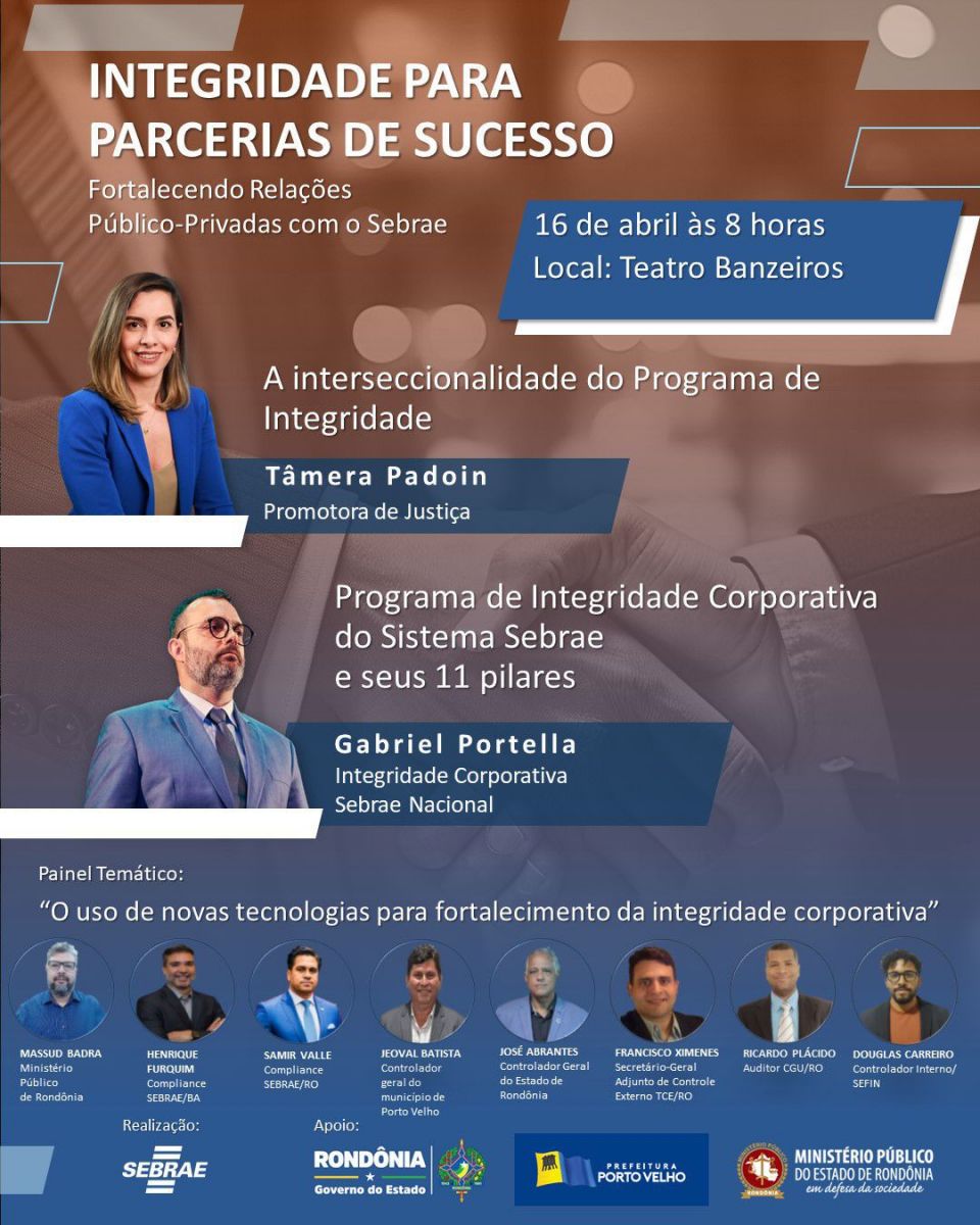 “O encontro “Integridade para parcerias de sucesso - Fortalecendo as relações público-privadas” tem como público-alvo as entidades do Conselho Deliberativo do Sebrae/RO, dirigentes, conselheiros, encarregados de dados, advogados, profissionais de compliance, riscos e controle interno, órgãos de controle, prefeituras, dentre outros que contribuem de forma direta ou indireta para a integridade corporativa. Por isso, fica aqui o nosso convite para no dia 16 de abril estarmos reunidos em mais esse importante evento do Sebrae Rondônia”, convida o diretor-superintendente do Sebrae RO, Clébio Billiany de Mattos.