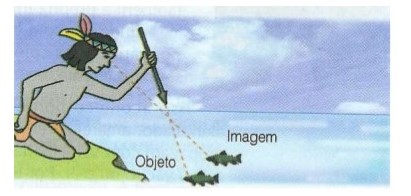 Maicon Maciel comenta que “outra prática Indígena e que tem muita física envolvida, está na caça com lança, onde o objeto dentro d’agua está numa posição aparente mais próxima da superfície. A esse fenômeno, chamamos na Física de refração da luz. Logo o índio, com sua experiência de vida, saberá lançar em uma posição mais abaixo do que a aparente para compensar a distorção da posição da imagem. A refração é um fenômeno ondulatório associado a mudança da velocidade da luz ao atravessar de um meio homogêneo para outro (no caso, ar e água)”.