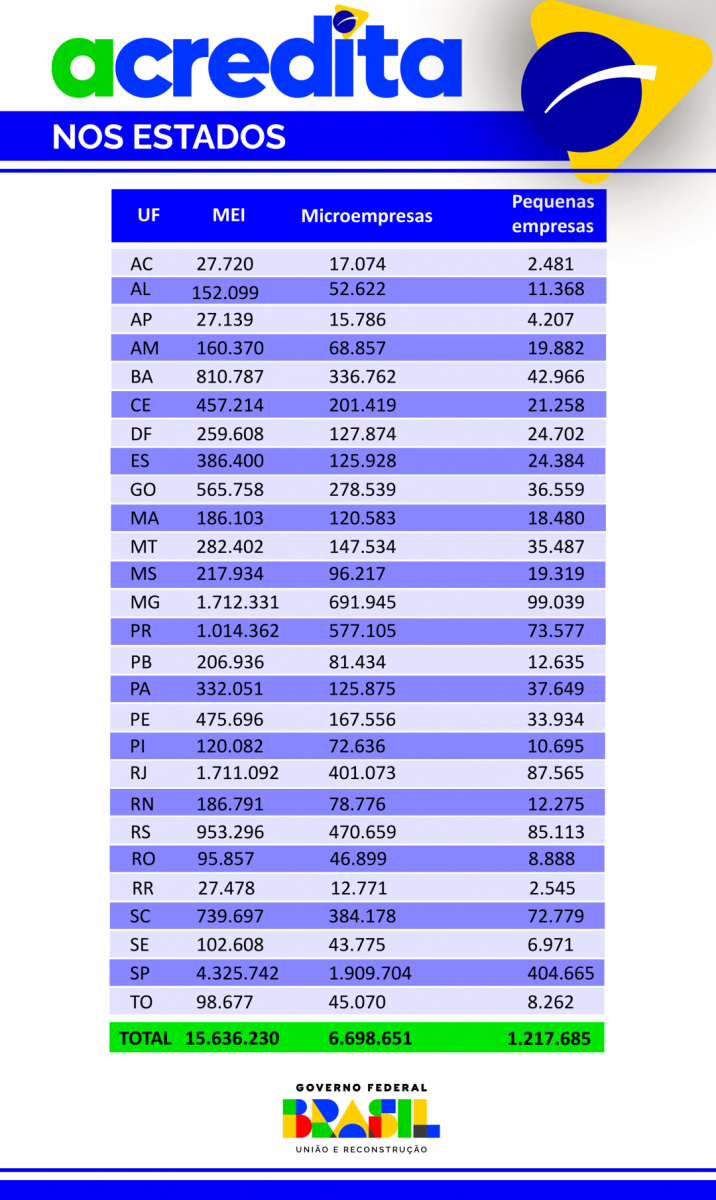 Rondônia tem atualmente 151.644 Microempreendedores Individuais (MEIs), microempresas e empresas de pequeno porte que podem ser beneficiados pelo Programa Acredita, lançado nesta segunda-feira (22/4) pelo Governo Federal. Entre as metas da iniciativa estão criar condições para ampliar o acesso a crédito, renegociar dívidas e garantir mais apoio a esses três setores da economia.