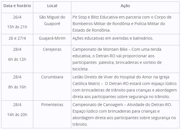 Com a mensagem “A Cultura de Paz e Acalmamento no Trânsito”, estabelecida para o mês de abril em conformidade com a Resolução nº 1.000 do Conselho Nacional de Trânsito (Contran), o Departamento Estadual de Trânsito (Detran-RO) realiza ações nos municípios rondonienses, com foco na prevenção de sinistros. Por meio de pit stops, blitzes, e atividades lúdicas em escolas, voluntários orientam a população, destacando a “Educação para a Paz”, salvaguardando a preservação da saúde e do meio ambiente.